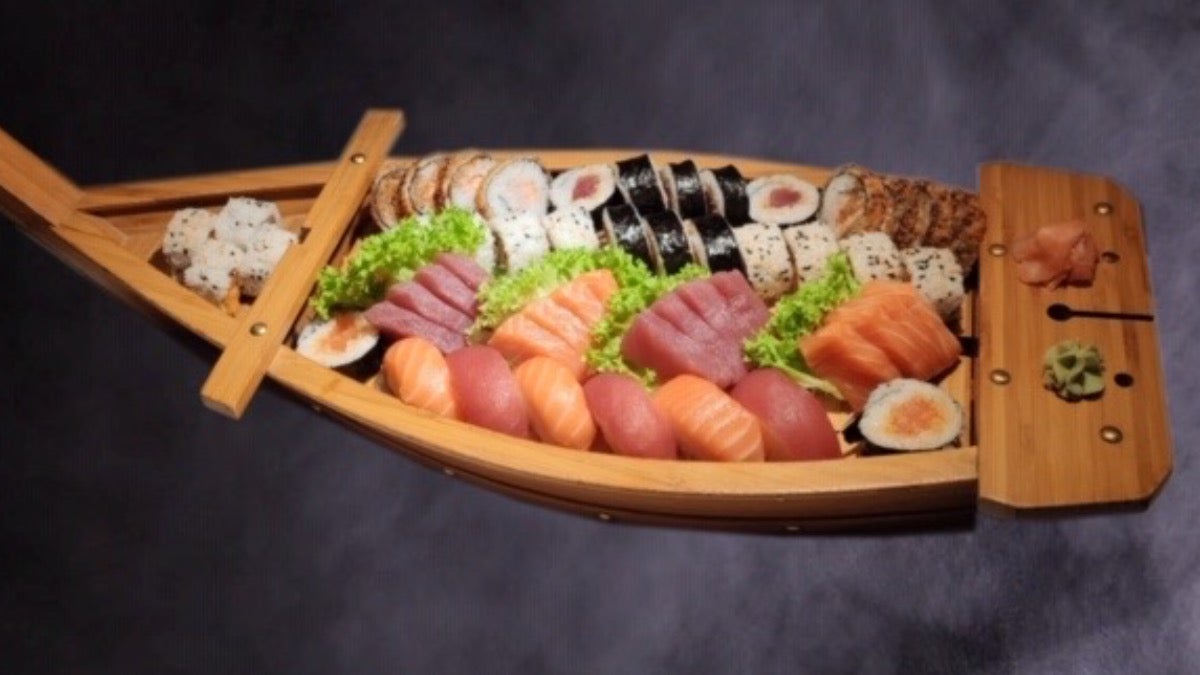 5 soft crunch, 5 california, 4 hoso tonijn, 4 sashimi zalm, 1 nigiri tonijn.