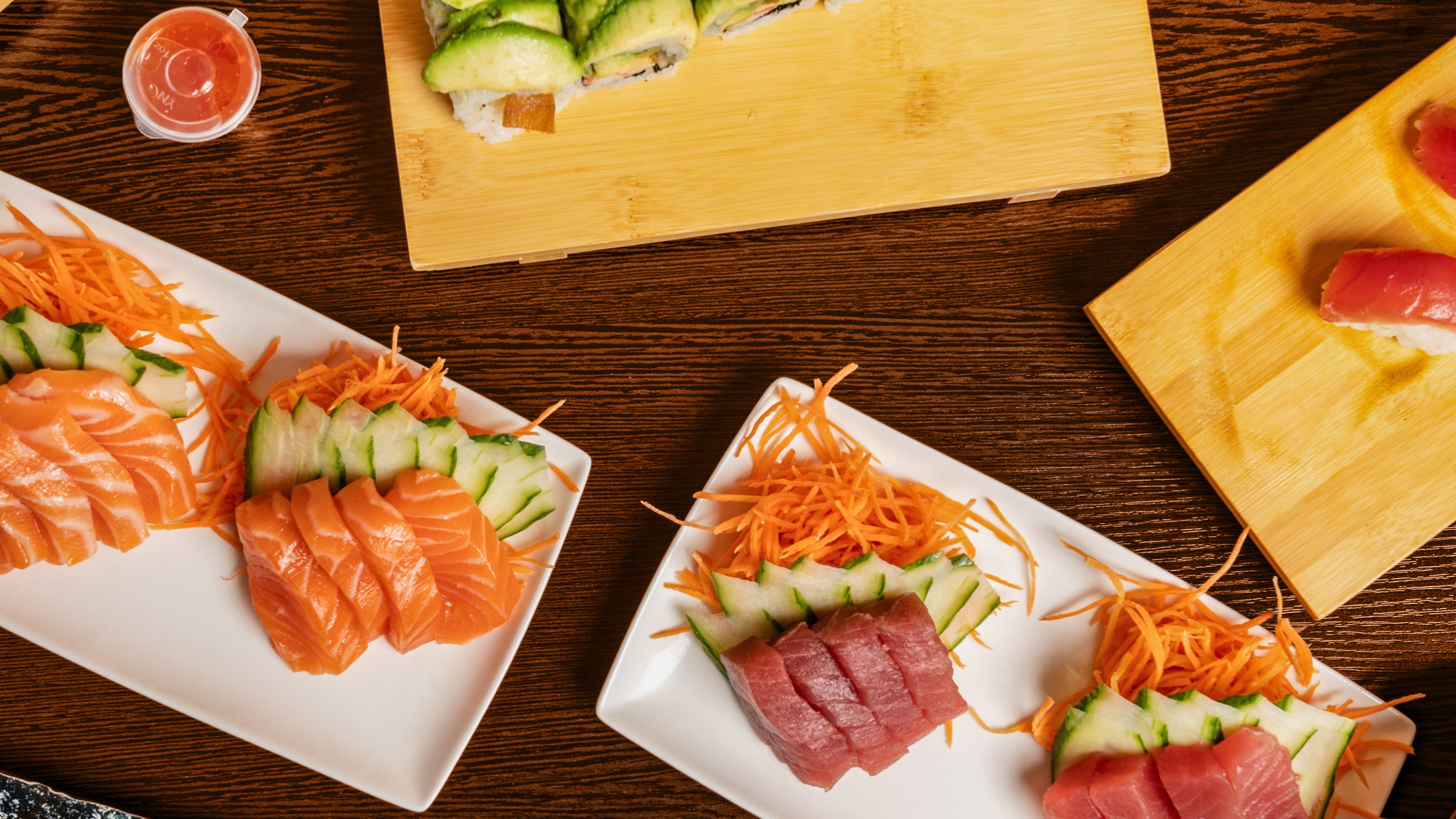 Assortiment van 60 stuks sushi. nigiri en sashimi van zalm tonijn.€95.00Moshi boot zalm tonijn 4 personen