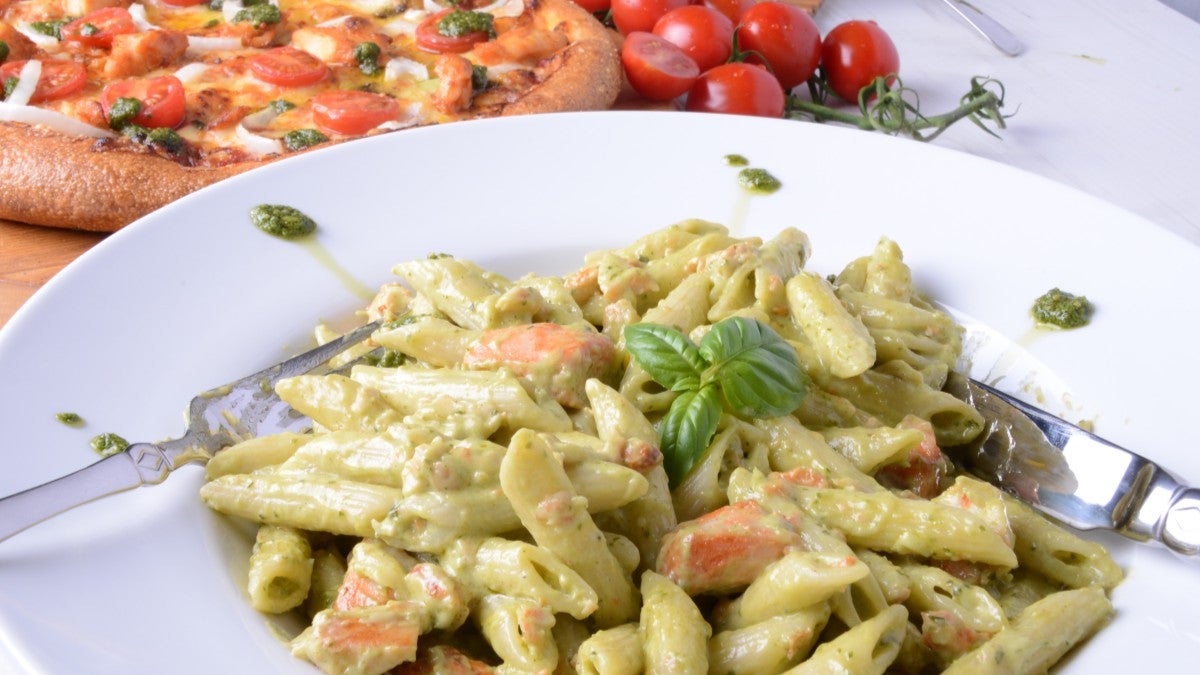 Pestosaus, kerstomaat, gegrilde kip, ui,€21.50Full Option