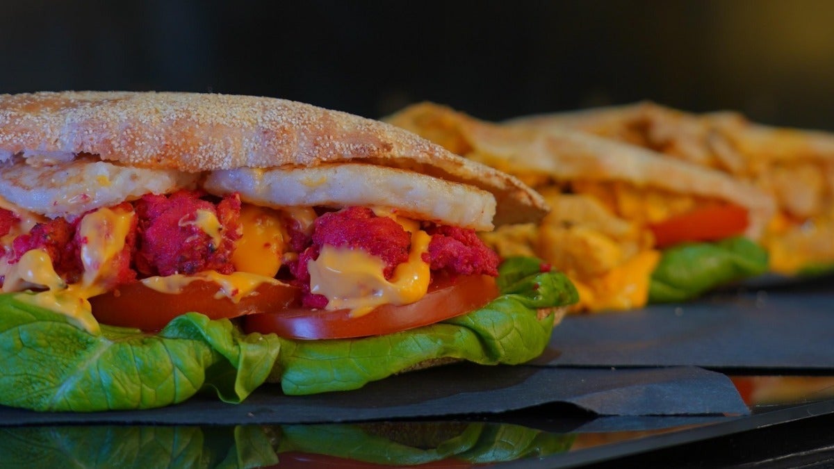 Poulet Tandoori, galette de pomme de terre, sauce au choix, fromage, salade, tomate, oignon caramélisé.