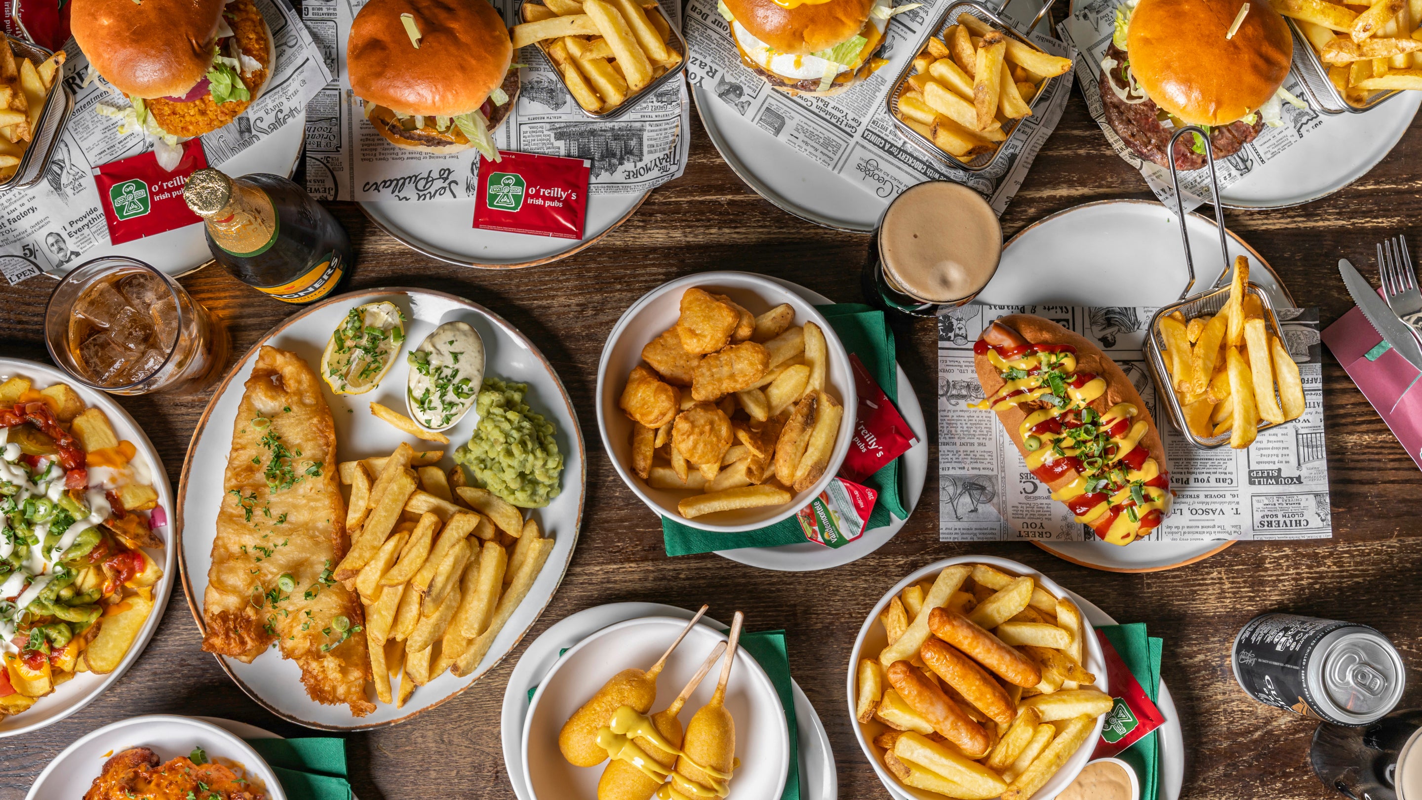 O’ Reilly’s famous hand pressed, 100% premium chargrilled Irish beef burgers with homemade sauce, served with chips and salad