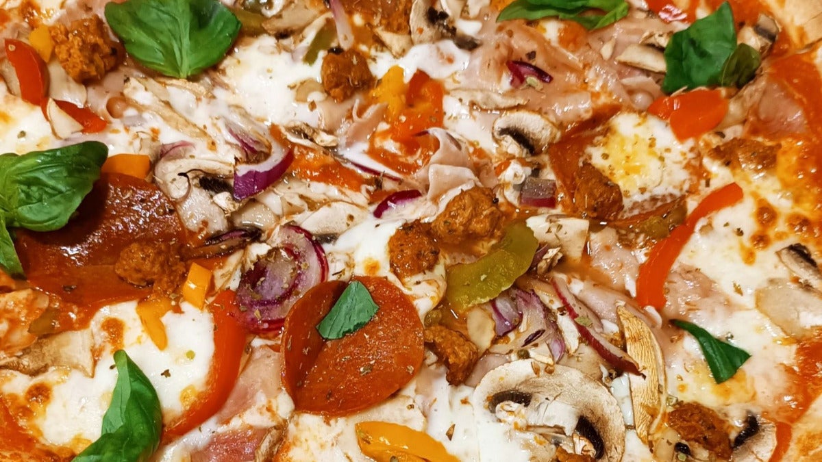 Sauce tomate, Mozzarella, jambon de dinde, champignons, artichauts, olives et origan.€13,00Pizza Volcano