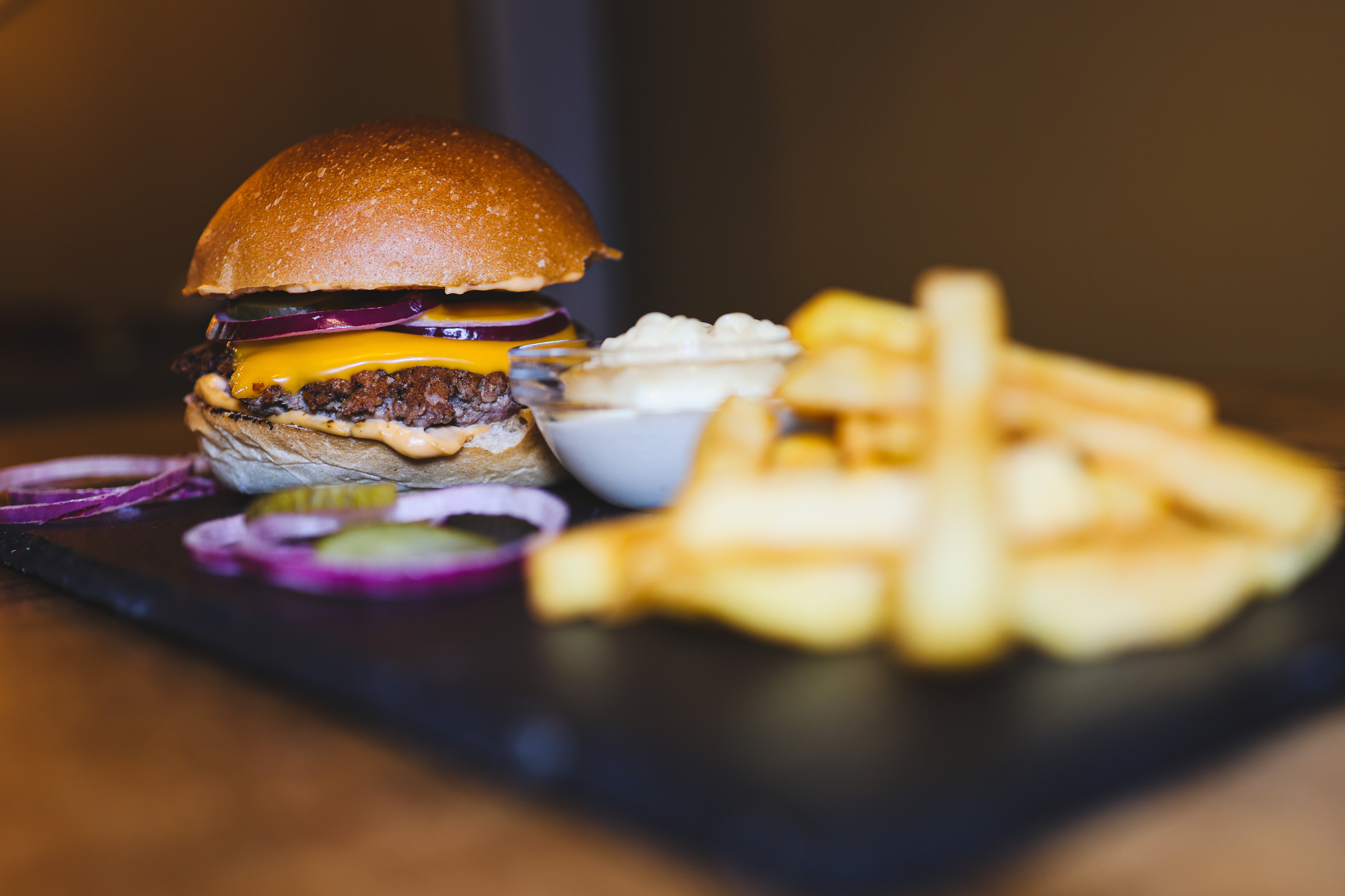 Steak haché smashé avec oignons blancs grillés, cheddar, cornichons.sauce burger.€14,50HalalLe Barbecue