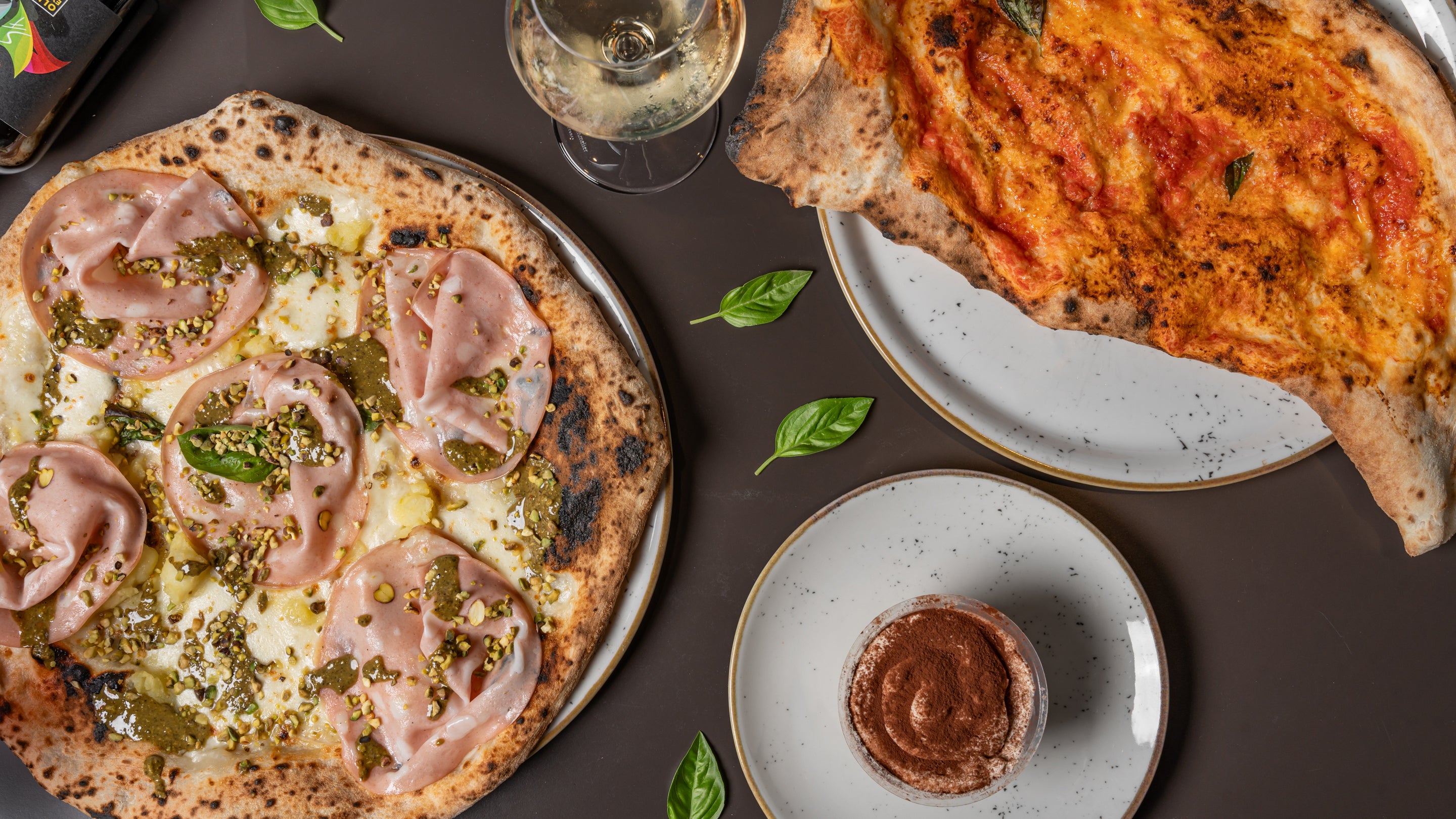 Sauce tomate San Marzano, ricotta de bufala Campana, jambon cuit, poivre, fior di latte, parmesan, basilic, huile d'olive