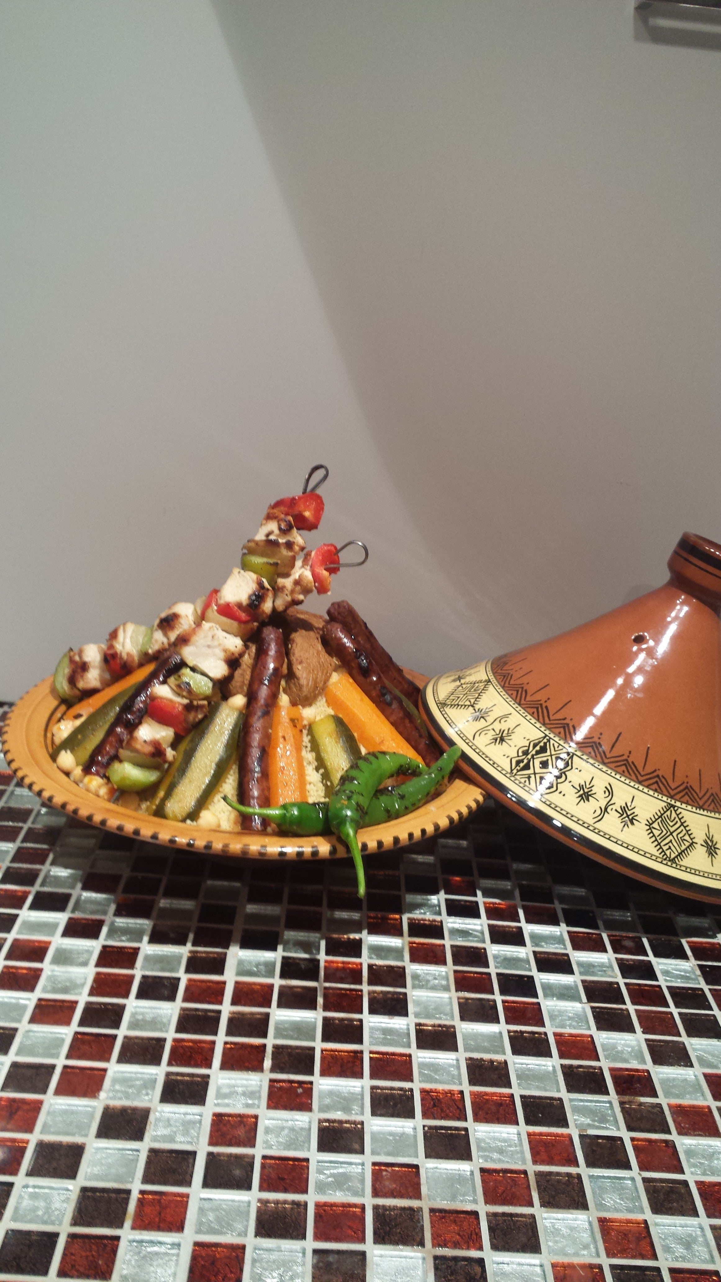 un couscous traditionnel ,une semoule fine exceptionnelle , des légumes de saison frais ,pois chiches ,persil , coriandre, des viandes de premier choix ( merguez,poulet ,boulette,agneau en brochette ou collier )